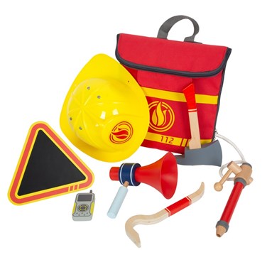 Ce sac à dos de pompier est équipé d'une lance à incendie en bois, d'une hache en bois, d'un pied-de-biche en bois, d'une radio en bois, d'un mégaphone en bois, d'un panneau de signalisation en bois rabattable avec surface de tableau et d'un casque de pompier en plastique à taille réglable. La double fermeture éclair permet d'ouvrir le sac à dos en grand et les emplacements en caoutchouc dans le sac à dos assurent l'ordre nécessaire et l'accès rapide à l'équipement en bois robuste ! Deux sangles à clic sur le sac à dos servent à fixer des accessoires supplémentaires.