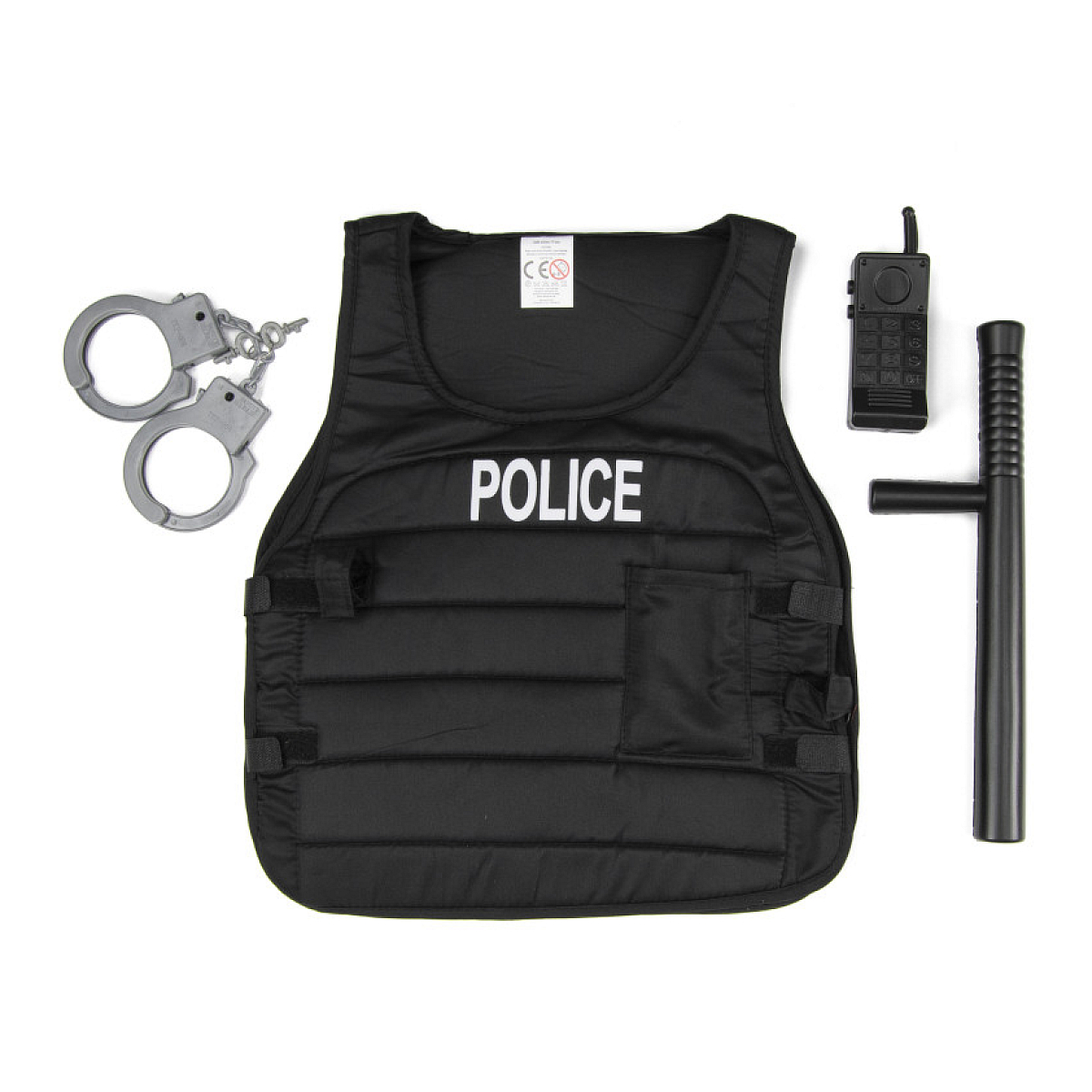 Ce set est composé d'un gilet "" pare balle"", d'une paire de menottes d'une matraque et d'un talkie walkie. ( les accessoires sont en plastique). MATIERE : 100% POLYESTER + MOUSSE POLYURETHANE. LAVAGE A SEC. NE PAS REPASSER.