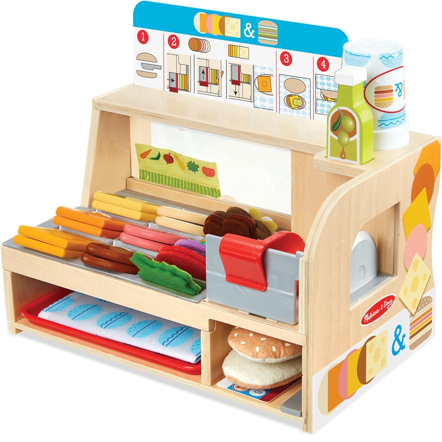 Comptoir à sandwichs, un jouet d'imitation de la marque Melissa and Doug.Cet article ne convient pas aux enfants de moins de 3 ans.Age minimum recommandé : 3 ansAge maximum recommandé : 8 ans