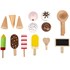 Ici, chaque gourmand peut choisir sa glace préférée. Qu'il s'agisse d'un bâtonnet ou d'un cône avec crème glacée, la décision est difficile à prendre... Les différents types de glaces peuvent facilement être accrochés sur le présentoir à glaces. La cuillère à glace magnétique permet de servir les boules de glaces et rend le jeu encore plus réaliste !