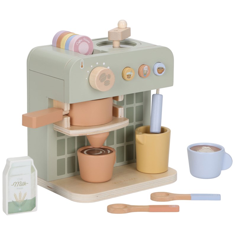 Avec cette machine à café en bois, les enfants peuvent imiter les grands en préparant leur boisson préférée : moudre, insérer une capsule, ajouter du lait ou décorer un cappuccino avec les pochoirs inclus. Un jeu réaliste et plein de charme qui invite au partage et stimule l’imagination.