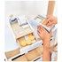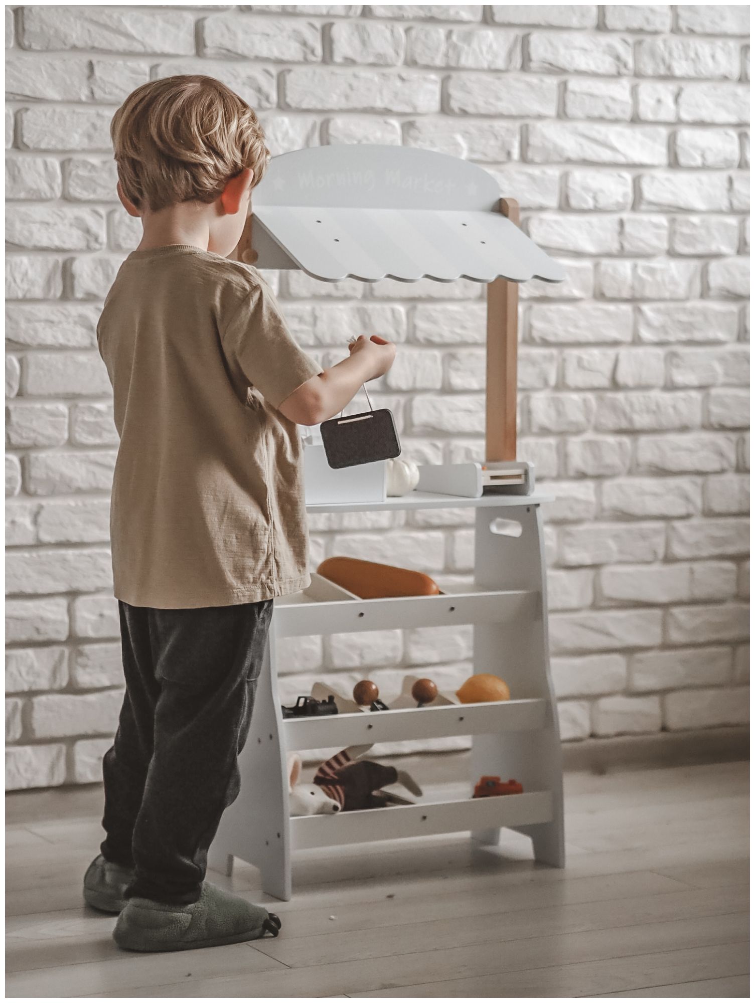 Stand-vendeur avec caisse en bois, permet à votre petit de prendre connaissance des notions de base de calcul en comptant les morceaux de fruit et légumes et les pièces de monnaies qui sont aussi incluses.