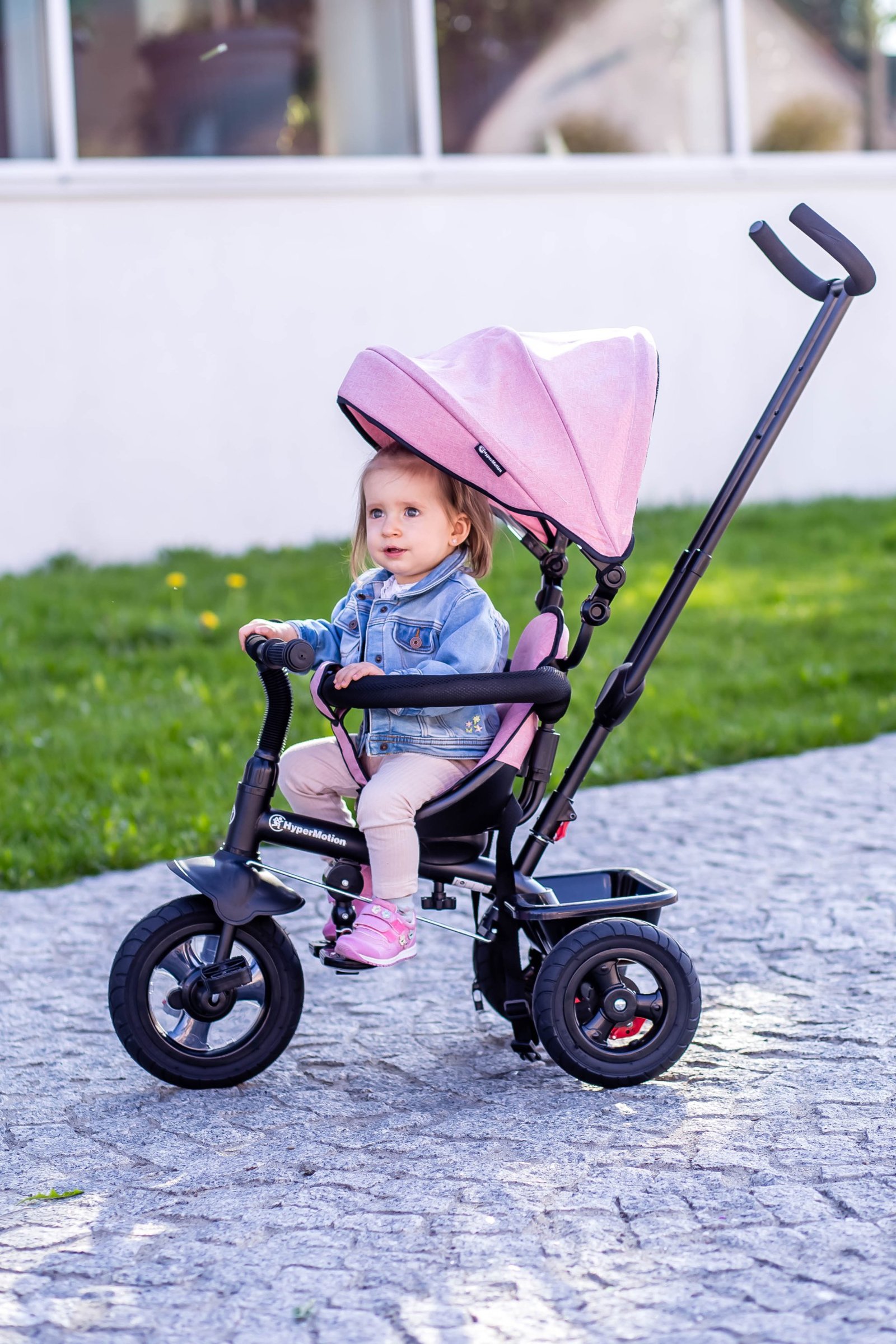 Les jeunes enfants peuvent s'asseoir confortablement sur le siège, poser leurs pieds sur le repose-pieds et se déplacer poussés par leurs parents à l'aide de la longue poignée attachée. Le volant de l'enfant et la barre du parent sont couplés, de sorte que le parent peut facilement contrôler la direction du voyage.