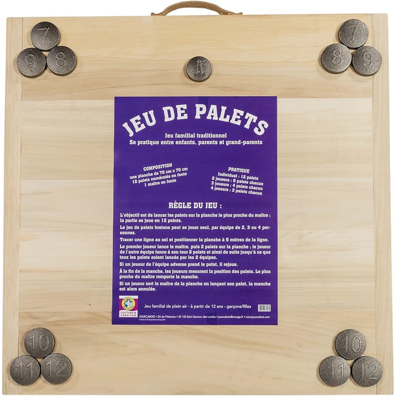 Jeu de plein air composé d’une planche, de 12 palets en fonte numérotés et d’un maître.