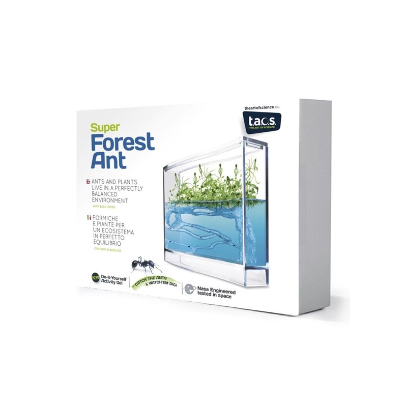 Observer les fourmis dans leur habitat naturelUn coffret complet pour créer un habitat écologiquement correct pour les fourmisDécouvrez l'univers fascinant des fourmis avec le Kit Super fourmilière forest ! Vous pourrez observer ces insectes fascinants creuser à travers le gel, comme dans leur habitat souterrain naturel. Le kit contient tout ce dont vous avez besoin pour créer une maison écologiquement correcte pour les fourmis.Tous les éléments nécessaires inclus dans le kitDes instructions claires pour placer les fourmis et faire pousser des grainesLe kit comprend l'antquarium / vivarium avec le gel (dimensions 26 x 20 x 6 cm), un bâtonnet pour creuser quatre minuscules fosses qui seront plus tard les quatre entrées principales du réseau de tunnels creusés par les fourmis, une loupe pour observer les fourmis faire leur travail et creuser à travers le gel comme dans leur habitat souterrain normal, des instructions pour savoir comment placer les fourmis, ainsi que quelques réponses à des questions fréquemment posées dans ce contexte, une boîte pour attraper les fourmis, et un sachet de graines à faire pousser sur le dessus du gel. Il y a suffisamment d'air dans le vivarium pour que les fourmis respirent toute leur vie, mais il est recommandé de soulever le couvercle plusieurs fois par semaine pour apporter un peu d'air frais.Maintenance minimale grâce au gel nourrissant pour les fourmisUn gel nourrissant et écologique pour les fourmisLa maintenance est minimale, car en plus de fournir un habitat écologiquement correct, le gel fournit aussi l'alimentation des fourmis. Il est à noter que les fourmis ne sont pas incluses dans le kit.Des graines pour faire pousser des plantes et observer leur interaction avec les fourmisConseils pour faire germer les graines et éviter la condensation excessiveLe coffret Mega Fourmilière Gel inclut également des graines que vous pourrez faire germer au-dessus du gel. Vous pourrez ainsi observer la germination et la pousse de ces plantes