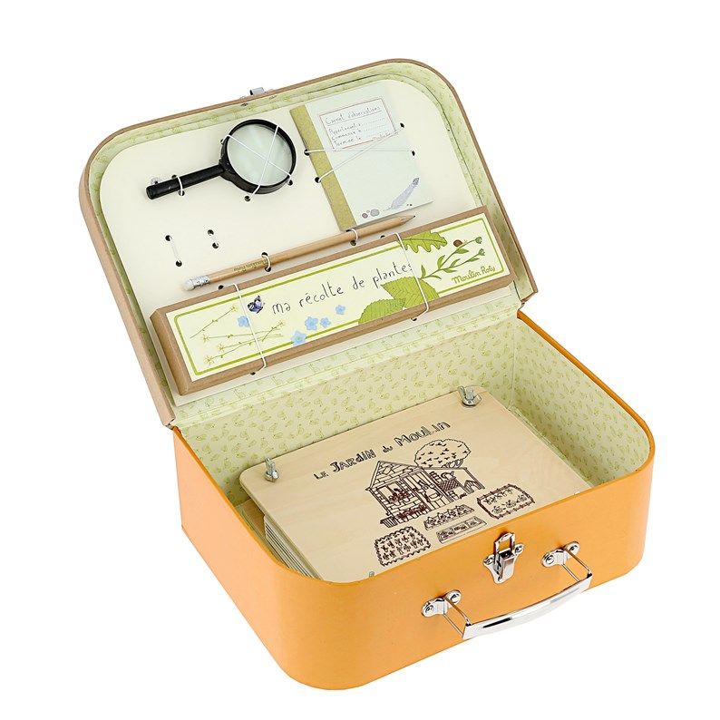 Contient : 1 valisette, 1 presse-fleurs, 7 bouts de carton au format presse-fleurs, 2 loupe, 1 boîte à trésors, 1 carnet d'observations, 1 crayon à papier avec gomme.