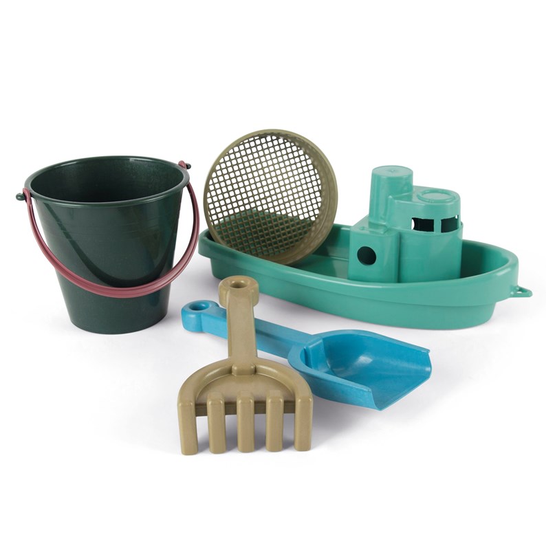 Cet ensemble de plage comprend un seau, un tamis à sable, un grand bateau, une pelle et un râteau, le tout livré dans un filet de rangement en coton. Issu de l'univers maritime Blue Marine Toys de chez Dantoy, ce set de plage offre de nombreuses possibilités de jeux sensoriels et d'exploration du sable et de l'eau en plein air.