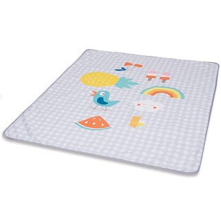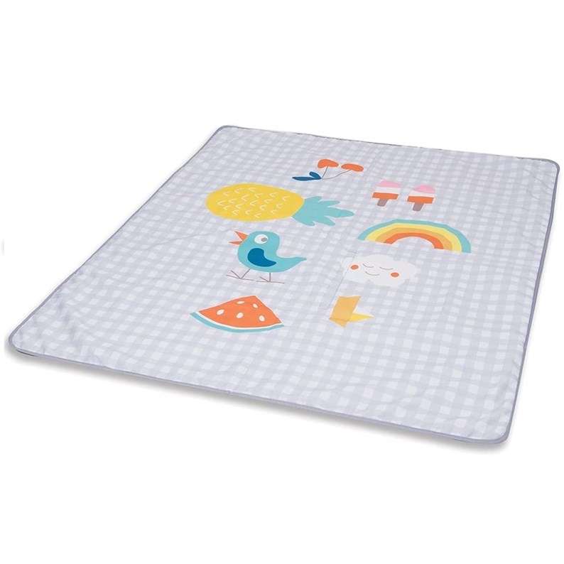 Le tissu est imperméable et le dessous lavable. Le tapis se transforme en sac de transport lorsqu'on le plie.