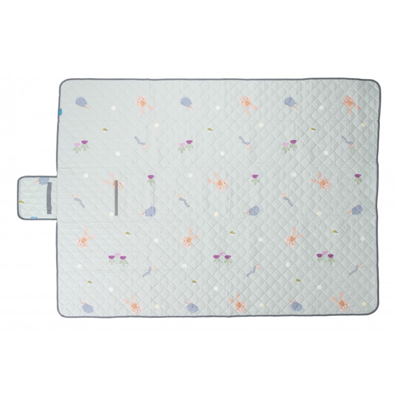 Le tissu est imperméable et le dessous lavable. Le tapis se transforme en sac de transport lorsqu'on le plie.