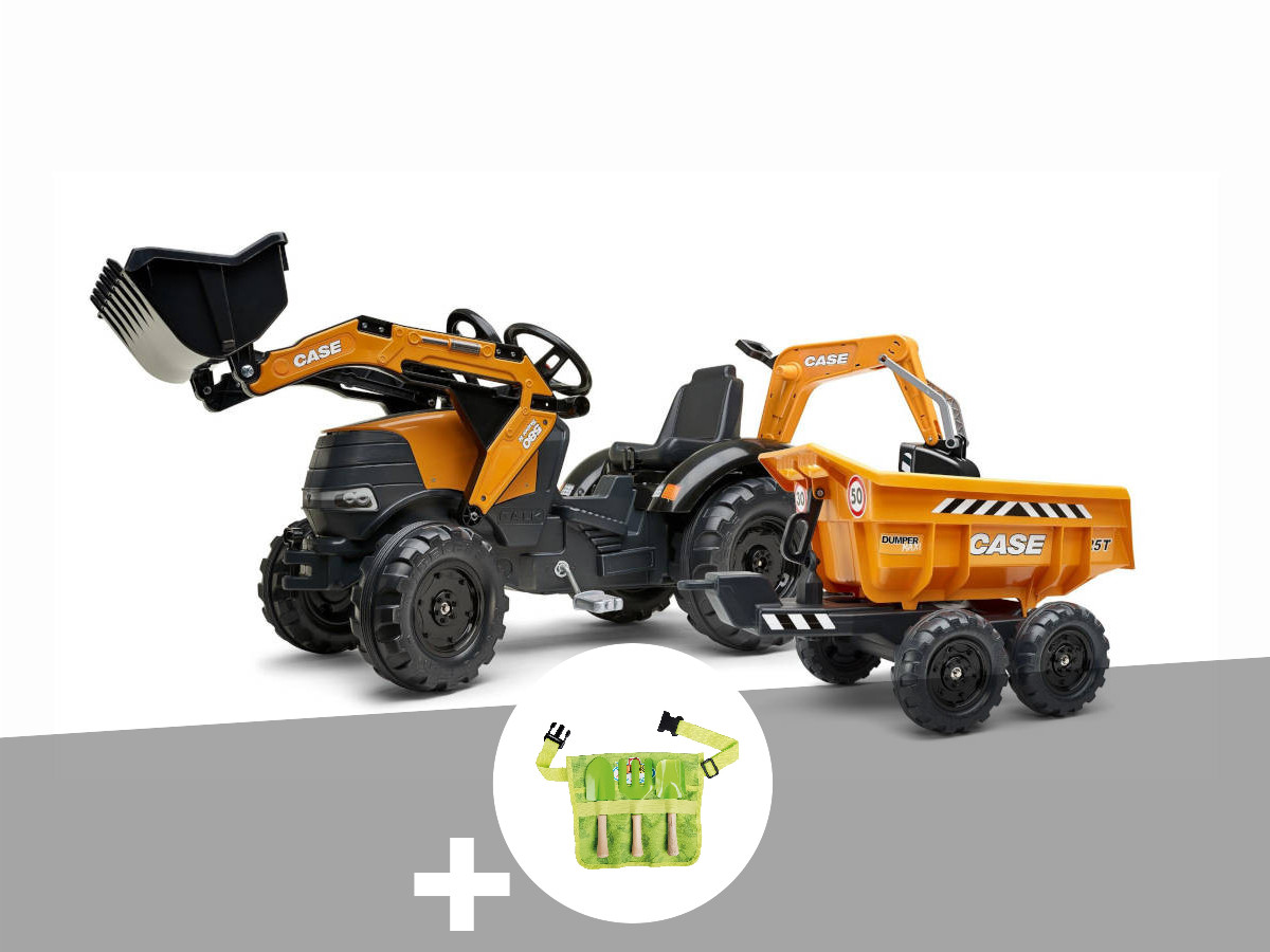 Tractopelle à pédales Case IH Construction avec excavatrice et selle pivotante de la marque Falk. Avec pelle frontale, excavatrice arrière et remorque grand volume détachable. Convient pour les enfants de 3 à 7 ans. Poids maximum de l'enfant : 50 kg. Dimensions (l x L x H) : 225 x 58 x 80 cm.
