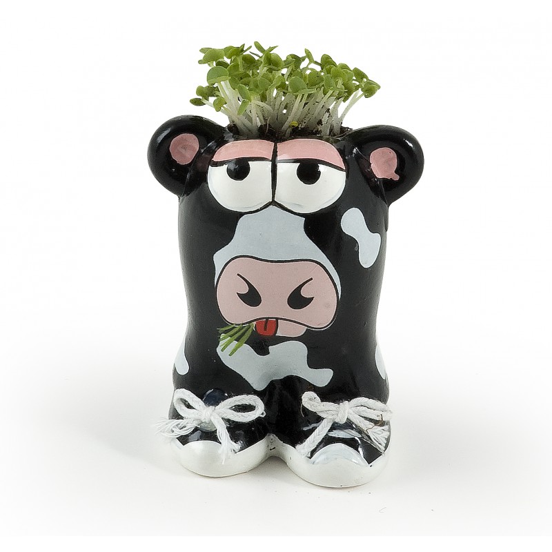 Vache en céramique avec cheveux raides ou bouclés à faire pousser.