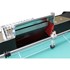 La sortie des balles est centrale de part et d'autre de la table. Le terrain de jeu est en Vinyl (type Gerflex ) vert très clair tracé ce qui ne casse pas la ligne très noir et blanc de la table. Les joueurs qui ont le même système de fixation que les joueurssur baby foot Bonzini B90 sont fixés sur des barres de 15,8mm d'épaisse en acier chromé. Cette épaisseur permet de tenir le choc bien mieux que les tables d'autres marques. Elles sont équipées de ressorts de part et d'autre ainsi que d'amortisseurs en caoutchouc pour limiter le bruit. Ces barres sont très résistantes et permettront à des adultes de jouer sans avoir peur de les tordre. La main courante sur ces modèles est noire. Les joueurs sont en fonte d'aluminium peints à la main et vous retrouverez d'un coté des joueurs au maillot noir, de l'autre un maillot gris. De part et d'autre du terrain, les cages en acier sont équipées dans le fond des buts d'une plaque en métal qui permet aux balles de faire retentir le bruit si particulier des authentiques babyfoots ainsi que de compte-points de couleur noir d'un coté et argent de l'autre.