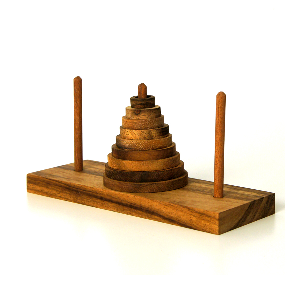 Les tours de Hanoï est un jeu de logique et de mathématique original dont l’objectif est de transférer la tour du pic central vers l’un des deux autres pics sans jamais poser un disque sur autre plus petit.