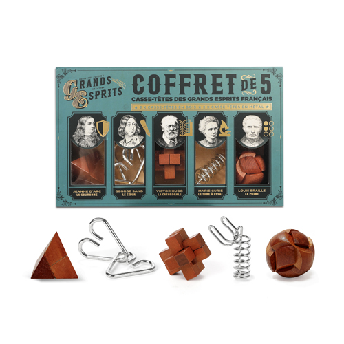 Ce coffret de casse-têtes vous invite à vous mesurer aux grands esprits de l'histoire de France. Il contient 5 casse-têtes fabriqués en bois ou en métal. Chacun est unique pour tester votre sens de l'observation, votre logique et... votre patience !