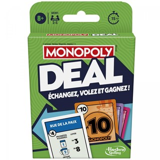 JEU DE CARTES MONOPOLY RAPIDE : On échange et on vole pour gagner au jeu de cartes Monopoly Deal, un chouchou des familles ! Le jeu Monopoly se retrouve dans un jeu de cartes rapide pour enfants et adultes. UNE PARTIE PEUT DURER 15 MINUTES : Achetez, vendez, négociez et gagnez encore plus rapidement ! Une partie de jeu de cartes Monopoly Deal peut durer 15 minutes seulement, parfait pour jouer en famille à n'importe quel moment de la journée ON COLLECTIONNE 3 GROUPES DE PROPRIÉTÉS POUR GAGNER : Dans ce jeu de cartes stratégique captivant, le premier joueur à collectionner 3 groupes de propriétés de couleurs différentes gagne LES CARTES ACTION MODIFIENT LA PARTIE : On peut utiliser les cartes Action pour percevoir un loyer, voler et échanger, ou recevoir de l'argent des autres joueurs lorsque « c'est votre anniversaire » FACILE À APPRENDRE : Le jeu de cartes Monopoly Deal s'apprend, s'enseigne et se joue en un instant. Il contient même des cartes de référence pratiques pour rappeler aux joueurs ce qu'ils doivent faire à leur tour, ainsi que des astuces et les règles du jeu