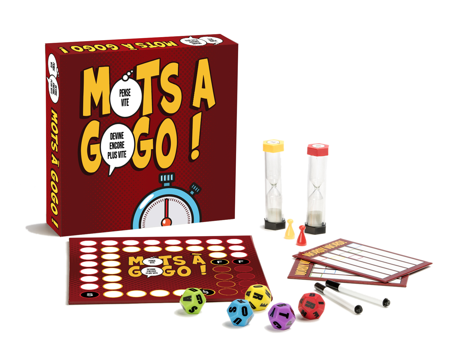 Contenu du jeu : 2 ardoises, 4 feutres effaçables, 2 sabliers, 5 dés colorés avec des lettres, 2 marqueurs de points, 1 plateau de jeu, un règle du jeu