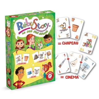 Règle du jeu: Distribue 10 cartes à chaque joueur. A ton tour, récupère une 11e carte et pose autant de cartes que possible en formant des rébus, voir des rébus croisés. Les cartes Joker remplacent une syllabe de ton choix, et la carte Rébustory 2 syllabes ! Plus tes rébus sont longs, plus tu marques de points, tu pourras alors multiplier les points de cartes. Si tu tardes trop, les autres joueurs retournent le sablier et tu n'as plus que 30 secondes pour poser tes cartes. Répioche ensuite pour avoir 10 cartes en main et c'est au tour du joueur suivante. Quand un joueur atteint les 300 points, on finit le tour et le joueur au plus haut score gagne la partie !