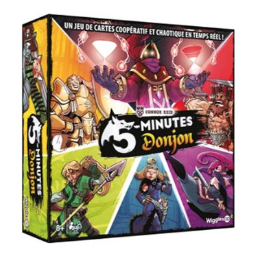 Un jeu de cartes coopératif et chaotique en temps réel ! Choisissez un héros, nettoyez le donjon, terrassez le boss. Le tout en 5 minutes ! Unissez vos forces pour venir à bout des pièges mortels et des monstres dangereux qui peuplent les Donjons ! Chaque joueur incarne un héros parmi les dix proposés, qui possèdent leurs propres cartes et capacités spéciales. Il n'y a pas de tour de jeu dans 5 Minutes : Donjon. C'est une course contre la montre où tout le monde tente de jouer des symboles qui correspondent à la carte actuelle du Donjon. Vous êtes tous dans le même bateau et votre équipe n'a que deux options : triompher du Boss et passer au niveau suivant? ou périr en essayant ! Commencez par le Bébé Barbare, puis continuez jusqu'au Maître du Donjon, le boss ultime !