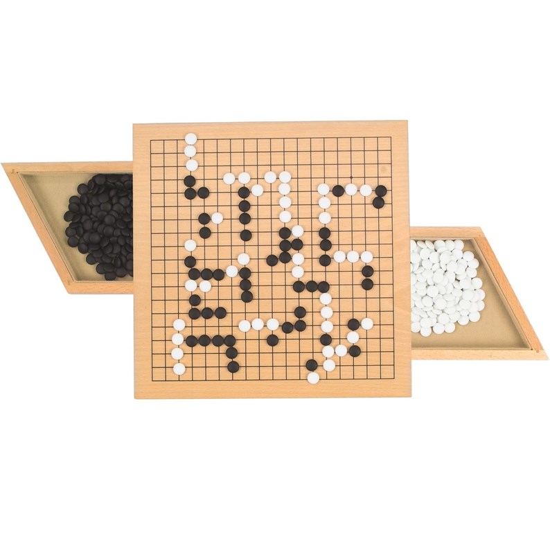Contenu : 1 coffret en bois (29,5 x 29,5 cm), 181 pions noirs, 180 pions blancs (diam. 13 mm), règle du jeu.