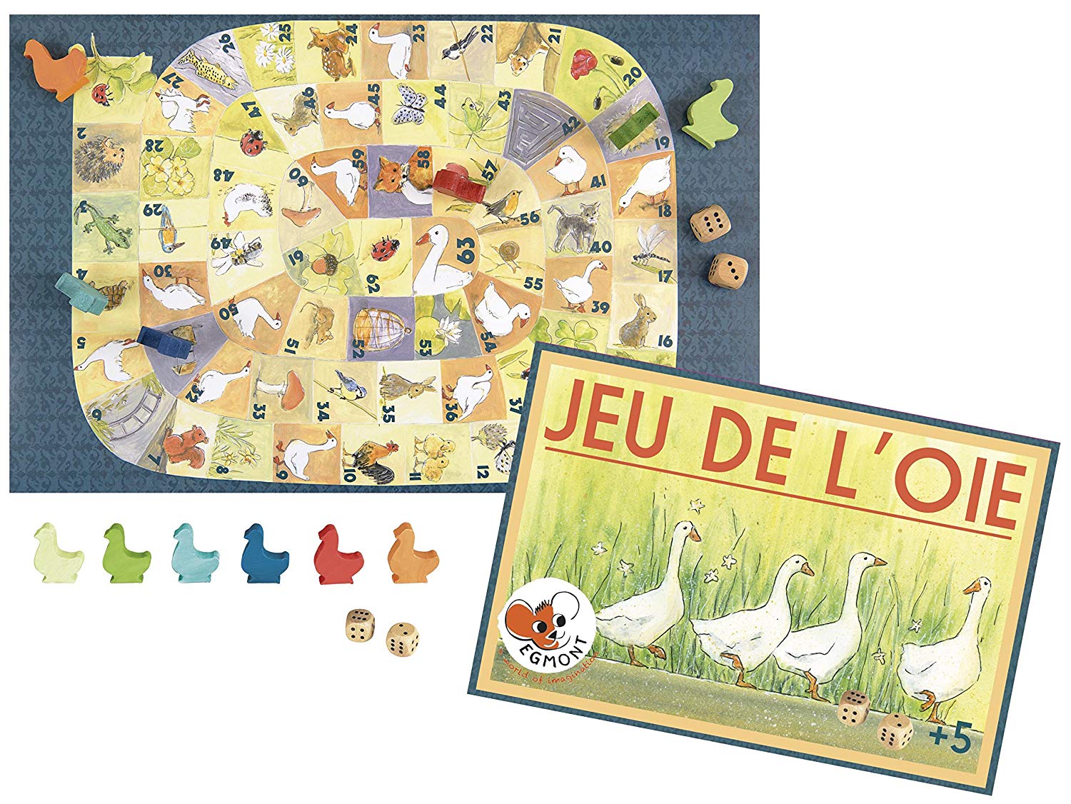 Contenu : 1 plateau cartonné, 2 dés et 6 oies en bois.