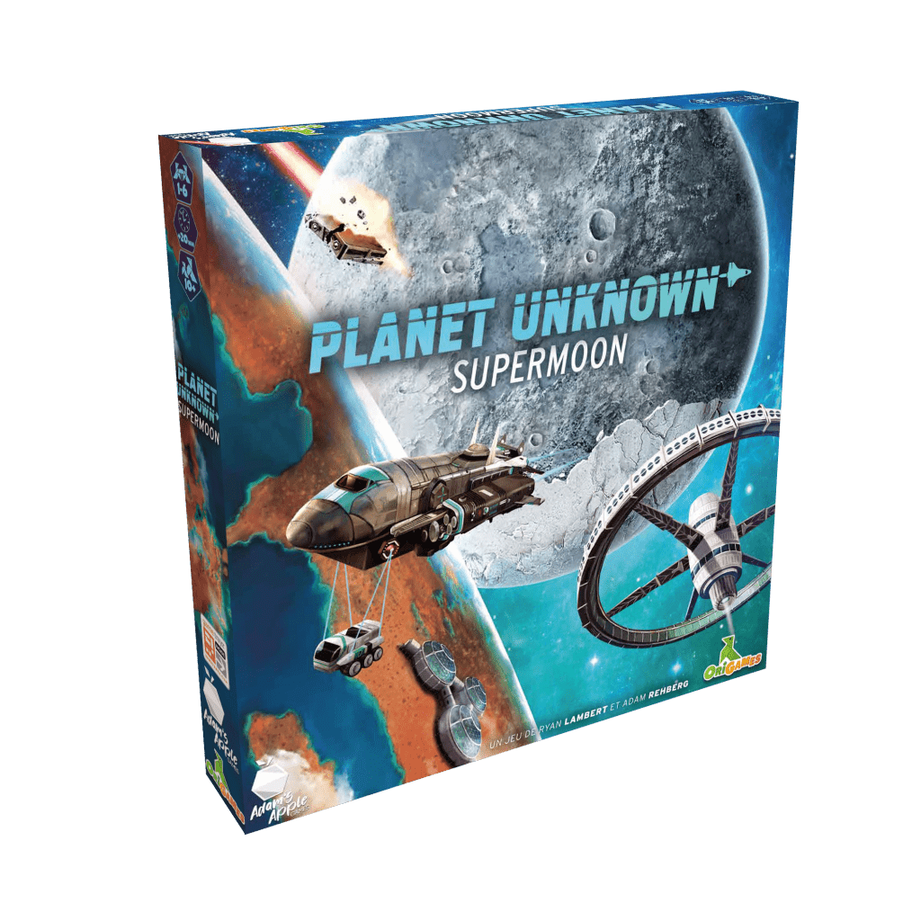 Supermoon est une extension du jeu Planet Unknown composée de 3 modules combinables ainsi que de nouvelles cartes à rajouter à vos parties. Le 1er module vous propose de terraformer une Lune sur laquelle vos tuiles pourront être placées au lieu de l’être sur votre Planète. Le Satellite en orbite autour pourra détruire toutes les Météorites dans sa ligne de mire. Le 2e module apporte de nouvelles tuiles et le 3e de nouveaux blocs terrains.