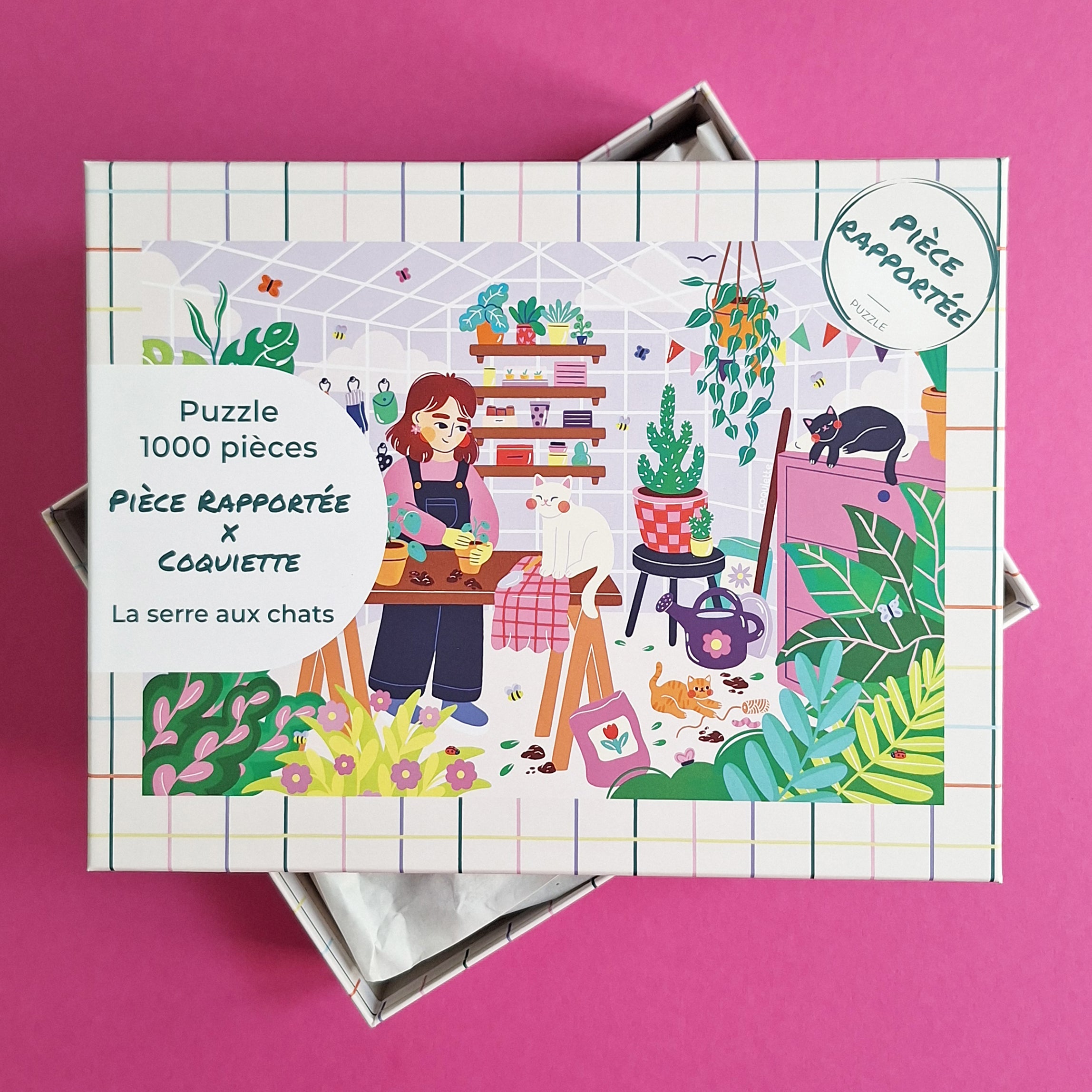 Bienvenue dans ""La serre aux chats"", un puzzle 1000 pièces signé Pièce rapportée qui mêle verdure foisonnante et chats malicieux. Entre les feuilles qui débordent, les pots qui valsent et les félins qui se faufilent partout, chaque pièce révèle une scène pleine de vie, de tendresse… et de bêtises poilues. C’est un petit monde à part, à reconstruire pièce par pièce, en savourant chaque détail. Un puzzle à faire tranquillement, avec un chat sur les genoux (ou non), une tasse de thé à portée de main, et le sourire en coin.