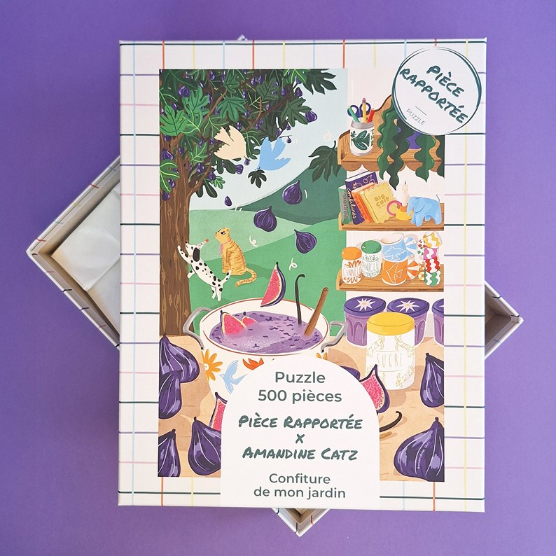 Bienvenue dans une cuisine baignée de soleil, où l’on prépare une confiture maison avec les trésors du jardin. ""Confiture de mon jardin"" est un puzzle 500 pièces plein de charme, de douceur et de détails à croquer. Sur le plan de travail : des figues mûres, une vaisselle chinée, et sur les étagères, mille petits trésors qui racontent une histoire. Dans le jardin, les animaux s’amusent à cache-cache entre les feuillages. Une scène pleine de poésie, de couleurs et de souvenirs d’été, à savourer lentement, comme une cuillère de confiture encore tiède.