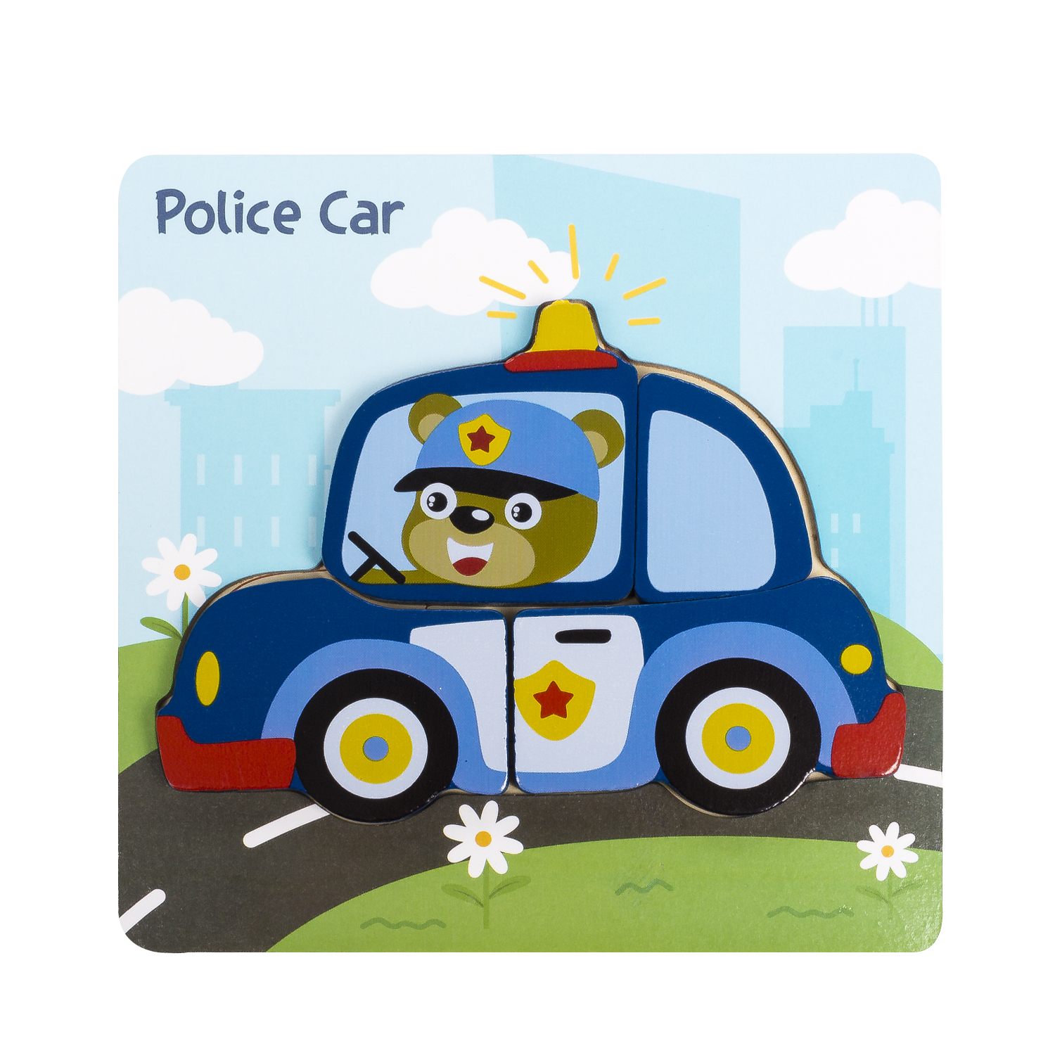 Puzzle en bois pour enfants, de 4 pièces. Design voiture de police.
