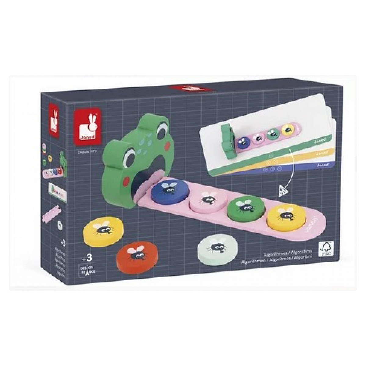 Jeu éducatif qui permettra à votre enfant d'apprendre à différencier les couleurs et identifier une suite logique. Contient: Une grenouille en bois, une langue divisée en 3 pièces qui s'imbriquent, 36 mouches sur des jetons colorés et 12 cartes modèles.