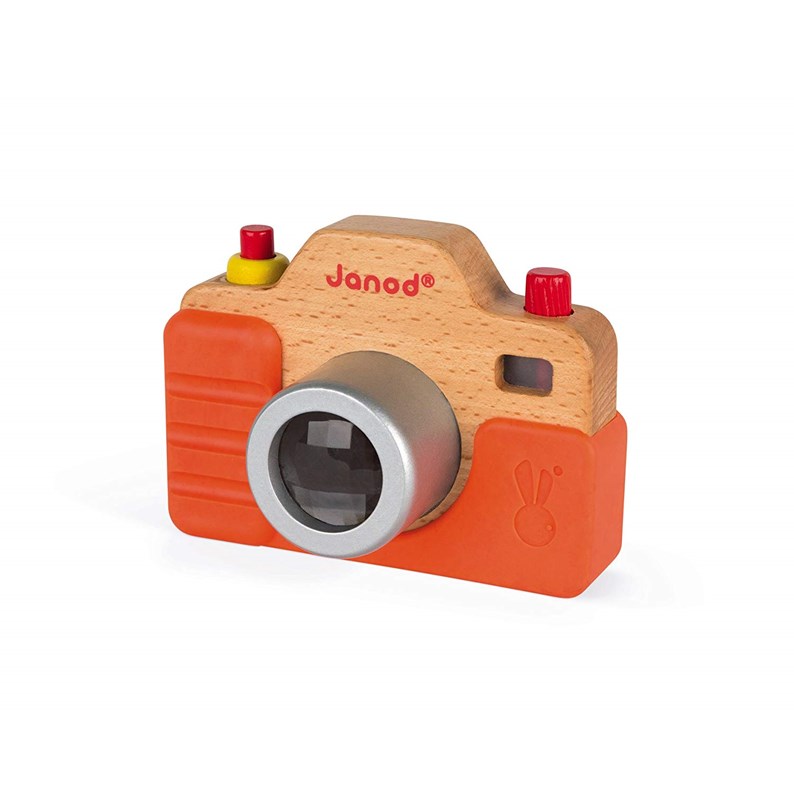Appareil photo sonore, un jouet en bois de la marque Janod. Référence J05335.Age minimum recommandé : 1 anAge maximum recommandé : 3 ans