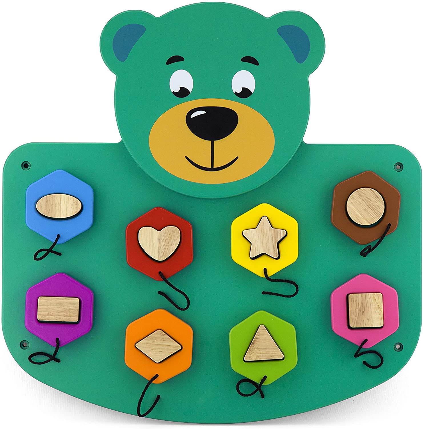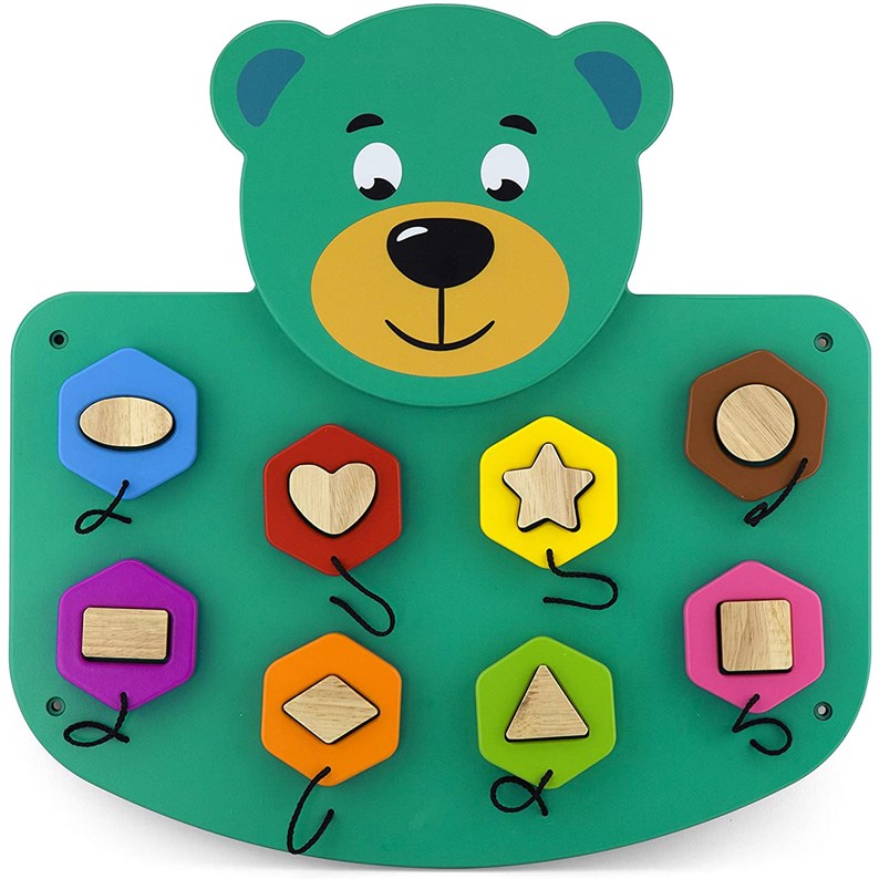 Grand tableau d’activité Ourson, un jouet d'éveil en bois coloré de la marque Sapin Malin. Référence SM50681.Age minimum recommandé : 12 moisAge maximum recommandé : 2 ans