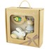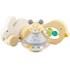 Cet ensemble se compose d'un lapin à faire rouler (10 x 6.5 x 8.5 cm), d'un nounours culbuto avec anneau transparent coontenant 5 billes (7.5 x 7.5 x 9 cm) et d'un hochet en forme d'oiseau avec 3 éléments mobiles (10 x 8 x 1 cm).