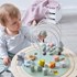 - Sur le plateau, les tout-petits découvrent : un rail de train circulaire avec 2 véhicules ; 2 arbres à empiler ; 3 loopings avec des billes, un moulin et une clochette ; 3 engrenages à faire tourner ; 5 formes à encastrer.