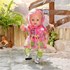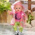 Comme on dit... Il n'y a pas de mauvais temps, juste les mauvais vêtements. BABY born a déjà acheté une tenue pour le prochain voyage sous la pluie. La veste de pluie transparente avec capuche est imprimée d'un motif léopard coloré. L'ami lapin Benno sur le t-shirt rose vous invite simplement à sauter effrontément à travers les gouttes. Pour pouvoir sauter sauvagement de flaque en flaque, BABY born porte des bottes à paillettes argentées. À la vue des pantalons verts à pois scintillants, le soleil est sûr de sortir à nouveau de derrière les nuages.