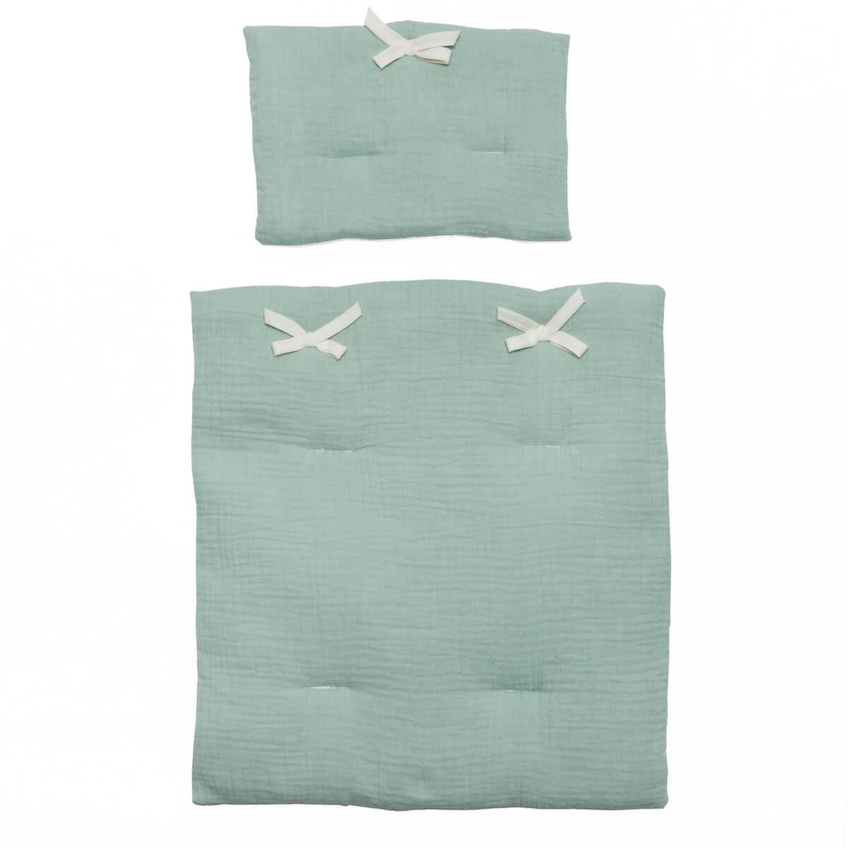 La couverture oreiller en coton bio BOBBLE vert est idéale pour assurer une douce nuit à la poupée de votre enfant !
