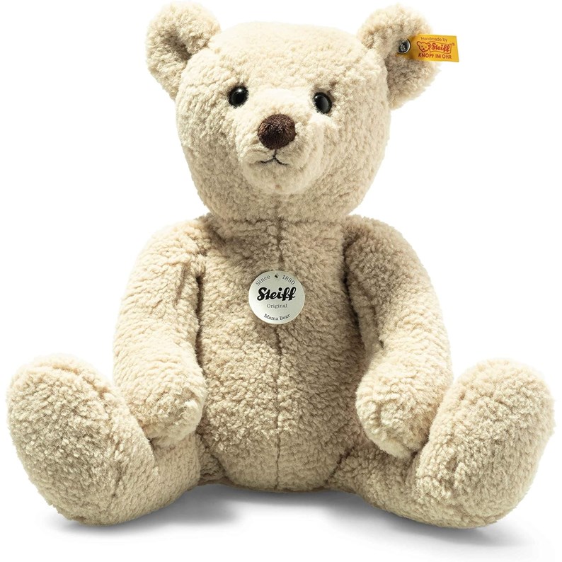 Maman l'ours Teddy fait partie de la bande des ours Teddy depuis 120 ans. Elle mesure 36 cm, elle est douce et mobile. Maman l'ours est dotée d'une peluche polaire douce et de colori beige, également appliquée sur les pattes et les pieds. Les coutures expressives sur le corps et les membres, une plaque thoracique personnalisée et le bouton en inox dans l'oreille sont des détails raffinés. Un regard expressif, un nez rond marron foncé, un petit museau fleuri et un sourire adorable feront craquer les petits.