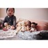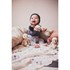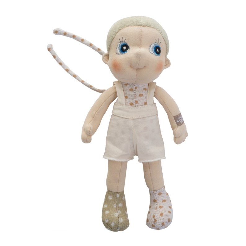 Quant à moi, je suis habillé d'un haut rayé, d'un short amovible et de chaussures à pois. J'ai une paire de ficelles sur le dos pour facilement m'accrocher à un sac, une poussette ... n'importe où, et suivre bébé dans toutes ses aventures.