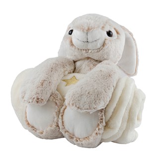 Cette peluche lapin de la marque Dani Créations est vendue avec une couverture accrochée entre ses pattes.
