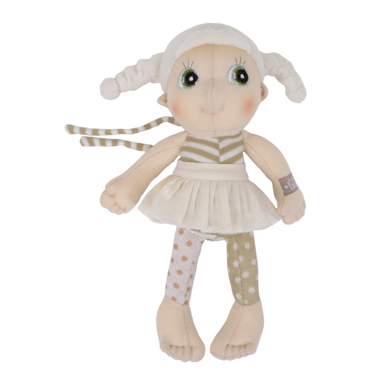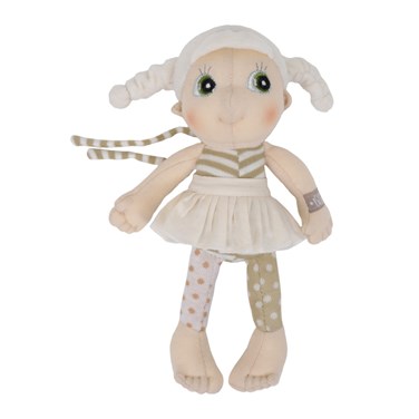 Quant à moi, je suis habillée d'un haut rayé, d'une jupe amovible et d'un legging à pois. J'ai une paire de ficelles sur le dos pour facilement m'accrocher à un sac, une poussette ... n'importe où, et suivre bébé dans toutes ses aventures.