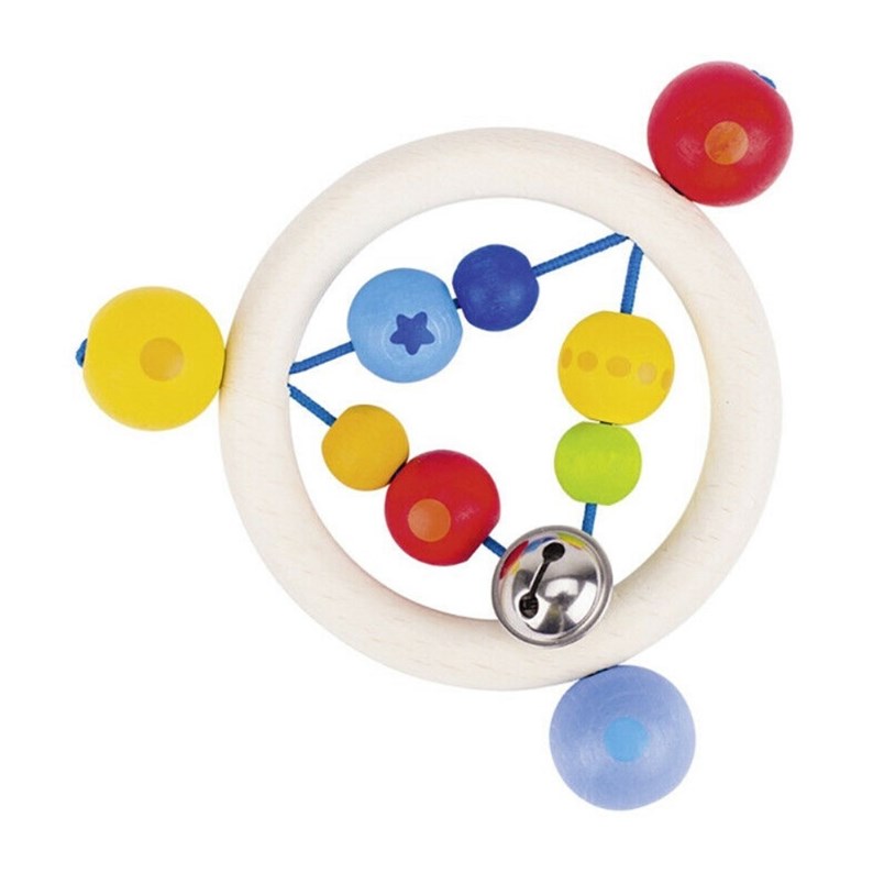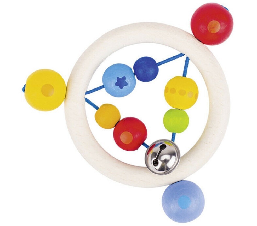 Hochet de qualité en bois, avec des boules colorées, et un grelot à la sonorité douce.