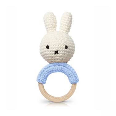 Il est particulièrement adapté pour les petites mains de bébé. La prise est facile par l'anneau de bois et son contact est doux et sans risque grâce au crochet délicatement tricoté.
