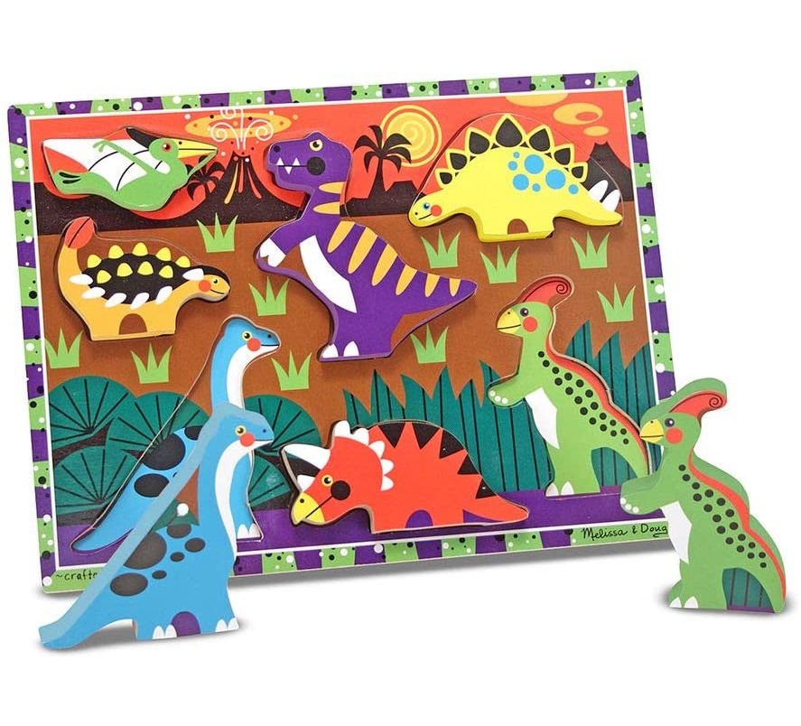 Chunky puzzle Dinosaures, un encastrement en bois de la marque Melissa and Doug. Réf. 13747.Age minimum recommandé : 2 ansAge maximum recommandé : 4 ans