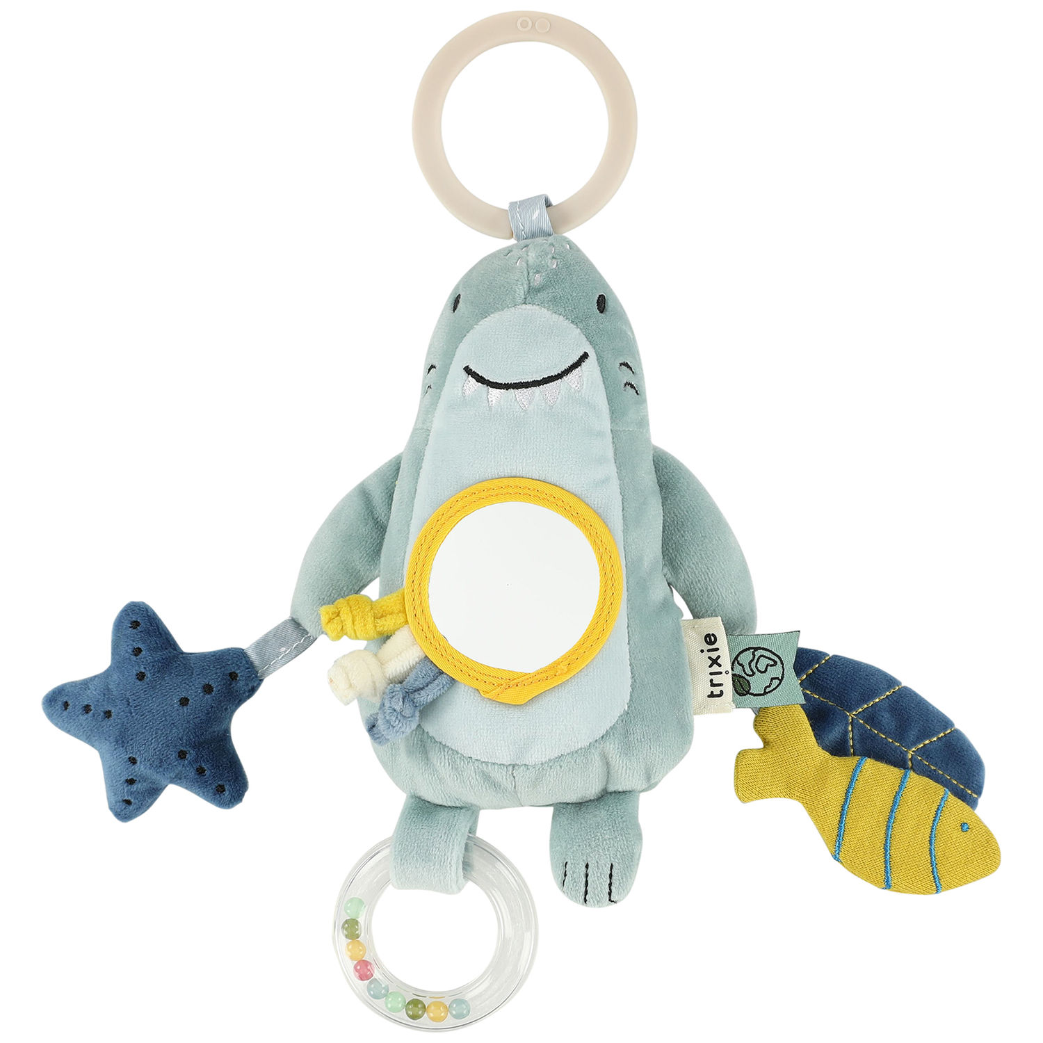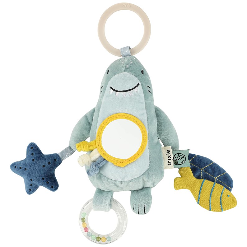 Accroché sur une poussette, un cosy ou un parc, ce jouet propose un miroir cache-cache, un hochet circulaire rempli de billes, du papier froissé et des cordons à tirer. Chaque interaction développe la motricité, l’audition et la vision de votre enfant. Fabriqué en coton bio et polyester recyclé, Mr. Shark allie douceur, sécurité et durabilité. Un jouet malin et amusant à emporter partout !
