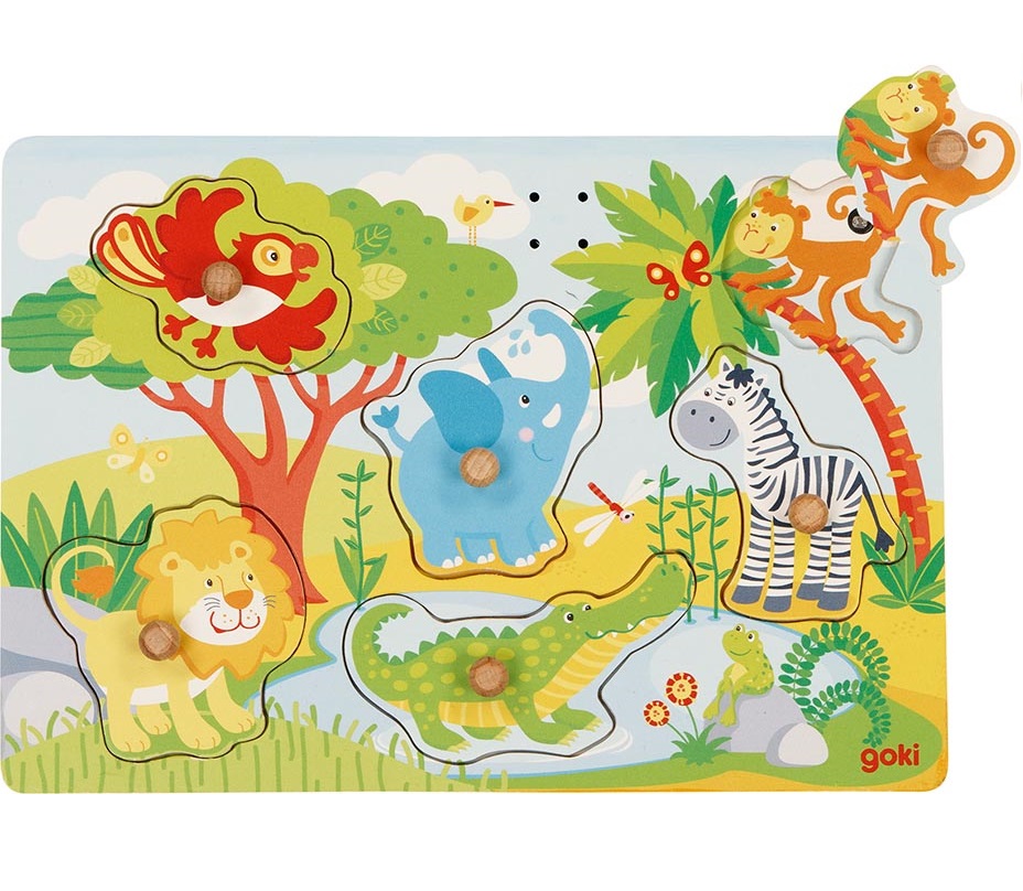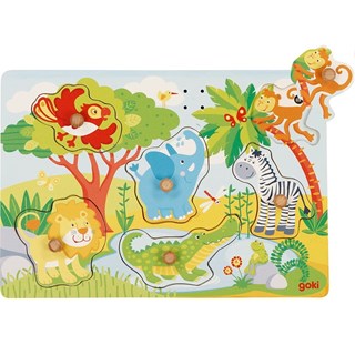 Puzzle sonore animaux du zoo, un puzzle en bois premier âge de la marque Goki. Référence 57398.Age minimum recommandé : 1 anAge maximum recommandé : 3 ans