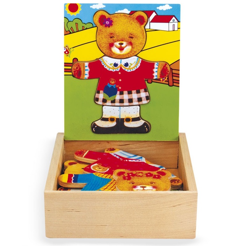 Ce puzzle en bois contient 18 pièces à encastrer : 6 corps, 6 paires de chaussures et 6 visages aux humeurs différentes soit un total de 216 combinaisons possibles ! L’enfant apprend donc à reconnaitre les formes, les couleurs et les humeurs.