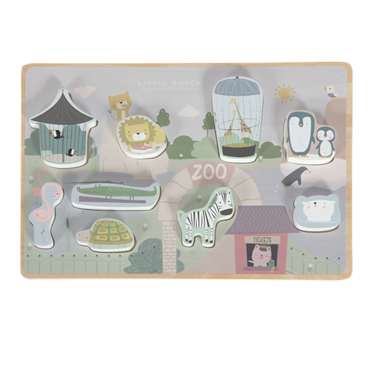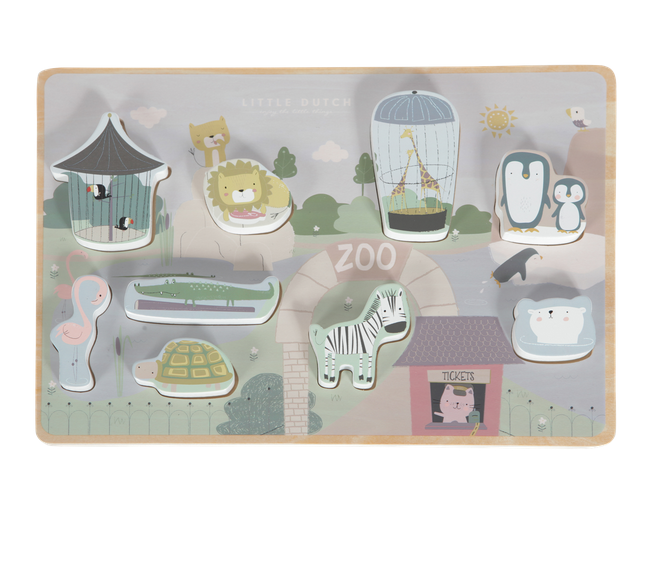 Puzzle à encastrer sur le thème du zoo, un puzzle 3D bois de la marque Little Dutch. Réf : LD4444.Age minimum recommandé : 1 anAge maximum recommandé : 3 ans