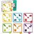 Chaque puzzle représente une couleur différente pour permettre à l'enfant de bien les identifier avec des illustrations liées : par exemple banane et soleil pour le jaune. Chaque puzzle (18 x 18 cm) est constitué de 4 pièces en carton et d'une pièce en bois à encastrer.