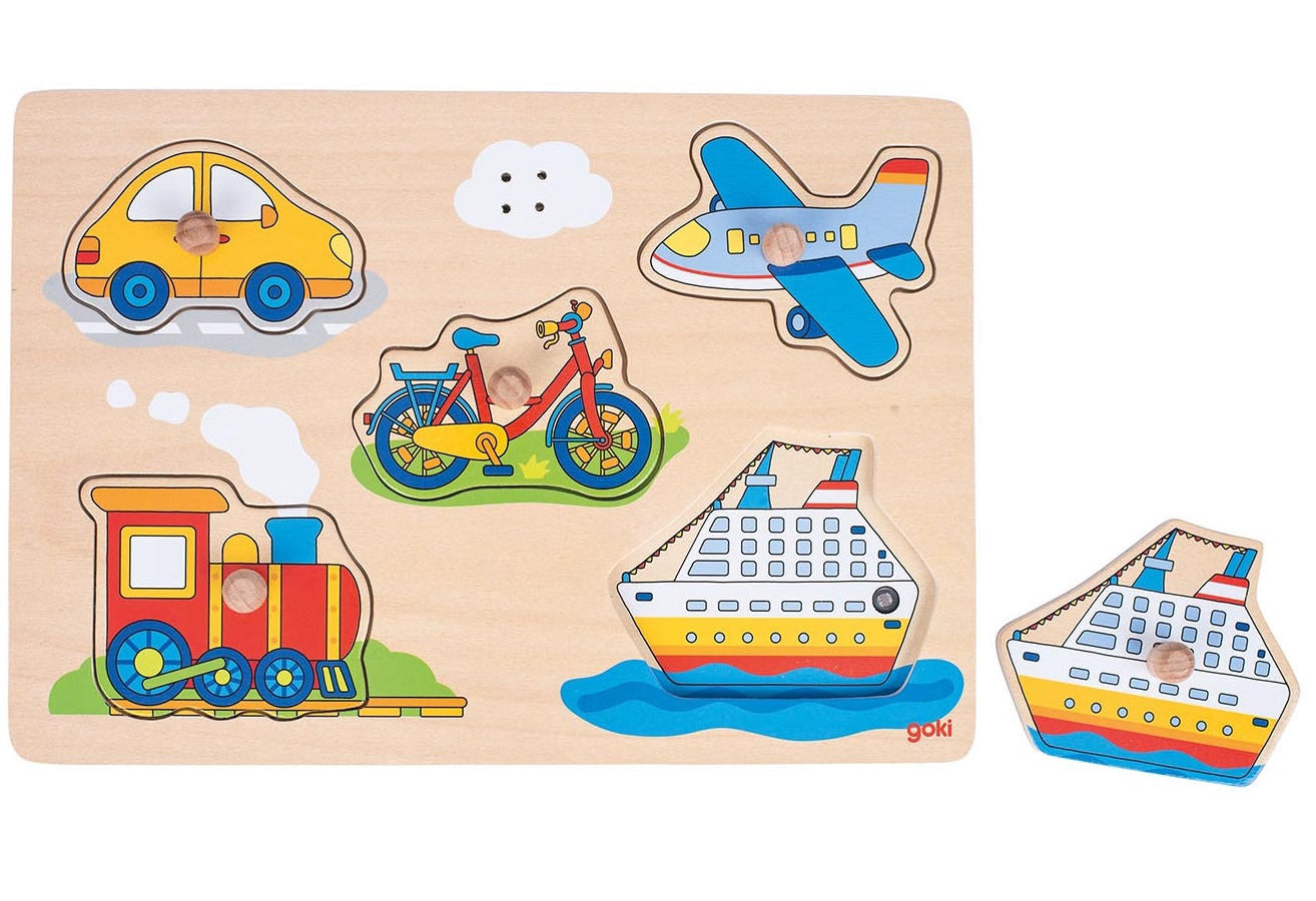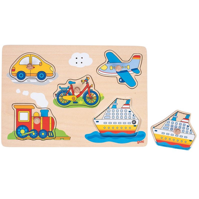Puzzle sonore véhicules, un puzzle en bois premier âge de la marque Goki. Référence 57519Age minimum recommandé : 1 anAge maximum recommandé : 3 ans