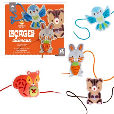 Quatre modèles sont disponibles avec deux niveaux de difficulté pour s’adapter à chaque enfant : un oiseau et un ours (1 pièce à lacer) et un peu plus difficile avec un lapin et un écureuil (2 pièces à lacer).