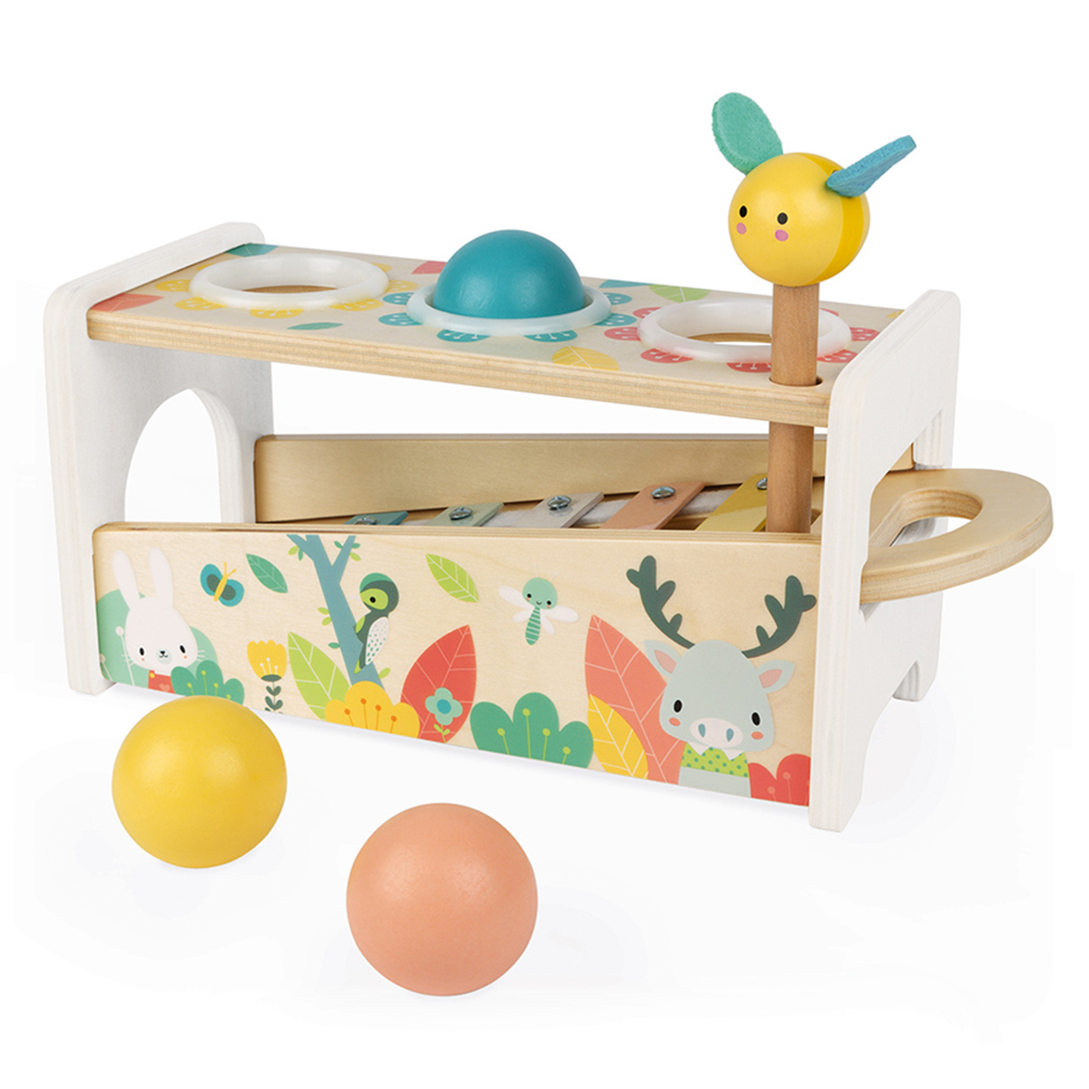 Ce jouet en bois à marteler et à tapoter est un joli jeu d'adresse dans des tons tout doux qui permettra à votre enfant de développer sa dextérité tout en s'amusant. Avec le marteau abeille, votre petit s'amusera à frapper sur les 3 balles pour qu'elles tombent en faisant tinter les touches du xylophone. Le xylophone est amovible et pourra ainsi être utiliser de façon autonome pour jouer partout !